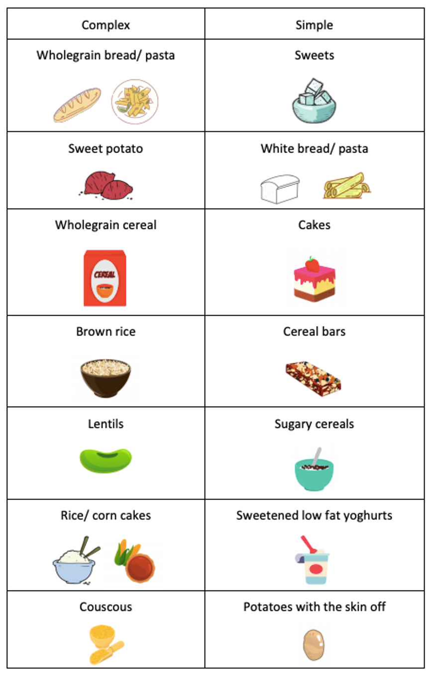 Carbohydrates can be largely broken down into two categories: complex and simple. Complex carbohydrates are made of long-chain molecules that require a longer time for your body to break down. In this way, they are slowly absorbed into the bloodstream and keep you feeling fuller for longer. Simple carbohydrates are those of sugars and other low fibre foods. They are short-chain molecules and because of this are readily absorbed into the blood stream. They can cause spikes and troughs in our energy levels, especially if our primary source of carbohydrates is simples ones.