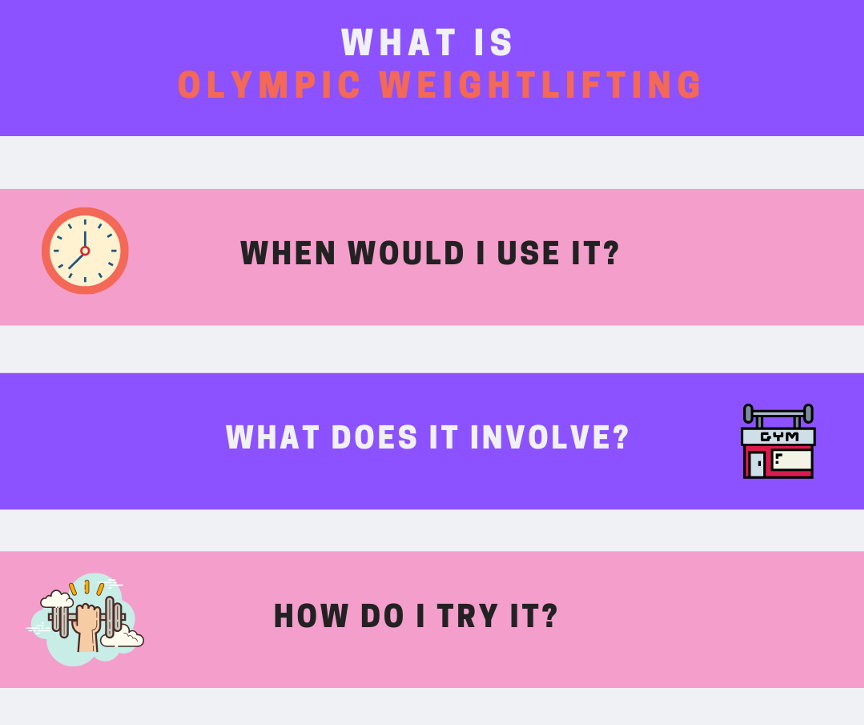 Learning the “Snatch” and the “Clean and Jerk” – they are the movements you see in the Olympics and are a combination of many of the movement patterns that are involved in general strength training. It involves strength, speed and flexibility. The aim of the sport is to lift as much weight as you can for 1 repetition of each of the 2 movements.